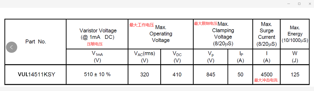2.  關于壓敏選型,例如220V的工作電壓,由于電網有波動因素,我們經驗的需要,加上一個安全系數。公式:220*1.414=311,得出311V的工作電壓,那么選用的壓敏工作電壓就要大于我們得出的電網工作電壓311V。如下圖產品TVR14511KSY的工作電壓VAC是320V,大于電網工作電壓311V,那么我們就可以選用這款壓敏電阻。但是根據環境電壓波動,可以選用工作電壓再大一點的壓敏電阻,如下圖產品TVR14561KSY,這樣就會更保險。