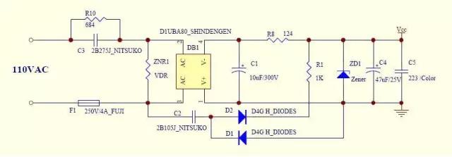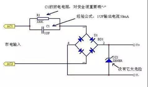 2、限流電容須接于火線,耐壓要足夠大(大于400V),并加串防浪涌沖擊兼保險電阻和并放電電阻。