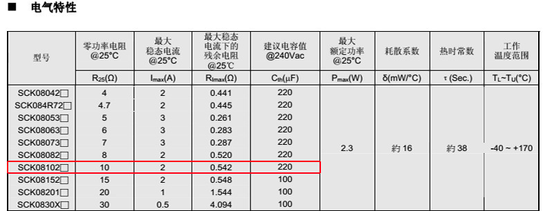 熱敏電阻: TKS 熱敏電阻型號(hào): SCK08102MSY 熱敏電阻片徑: Φ8mm 零功率電阻@25℃: 10Ω 工作溫度范圍: -40℃±150℃ 儲(chǔ)存溫度范圍: -40℃±85℃