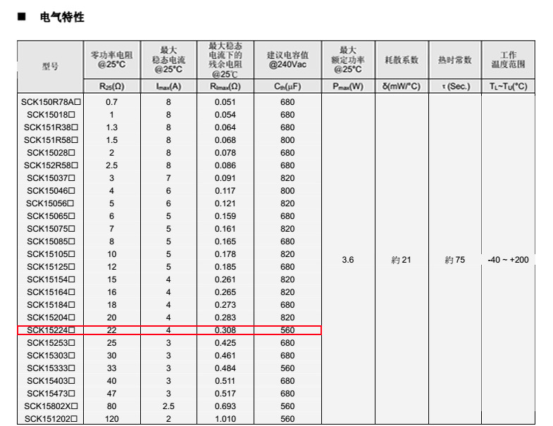 熱敏電阻: 穩(wěn)騰 熱敏電阻型號: SCK15224MSY 熱敏電阻片徑: Φ15mm 零功率電阻@25℃: 22Ω 工作溫度范圍: -40℃±200℃ 儲存溫度范圍: -40℃±85℃