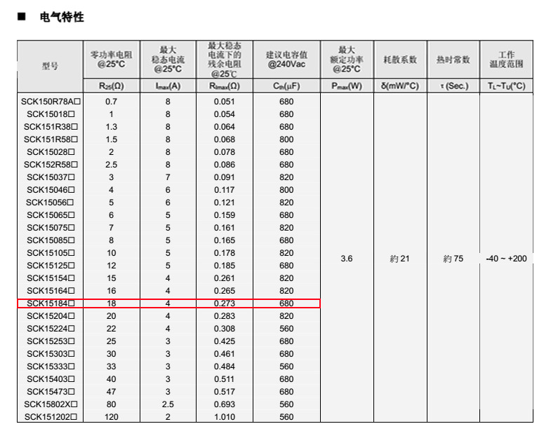熱敏電阻: 穩騰 熱敏電阻型號: SCK15184MSY 熱敏電阻片徑: Φ15mm 零功率電阻@25℃: 18Ω 工作溫度范圍: -40℃±200℃ 儲存溫度范圍: -40℃±85℃