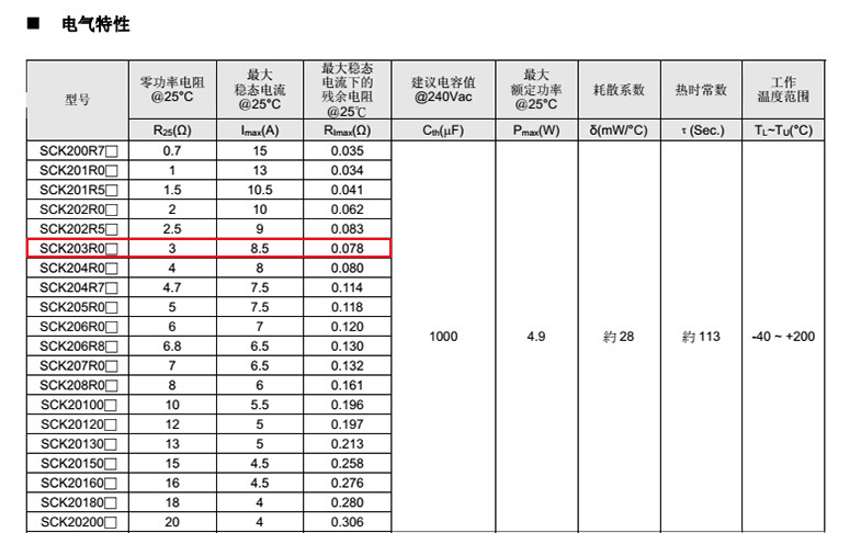 熱敏電阻: 穩騰 熱敏電阻型號: SCK203R0MSBY 熱敏電阻片徑: Φ20mm 零功率電阻@25℃: 3Ω 工作溫度范圍: -40℃±200℃ 儲存溫度范圍: -40℃±85℃