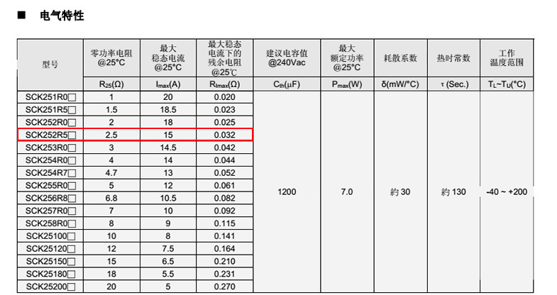 熱敏電阻: VT 熱敏電阻型號: SCK252R5MSY 熱敏電阻片徑: Φ25mm 零功率電阻@25℃: 2.5Ω 工作溫度范圍: -40℃±200℃ 儲存溫度范圍: -40℃±85℃