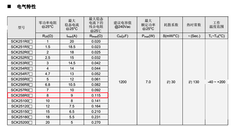 熱敏電阻: VT 熱敏電阻型號(hào): SCK258R0MSY 熱敏電阻片徑: Φ25mm 零功率電阻@25℃: 8Ω 工作溫度范圍: -40℃±200℃ 儲(chǔ)存溫度范圍: -40℃±85℃
