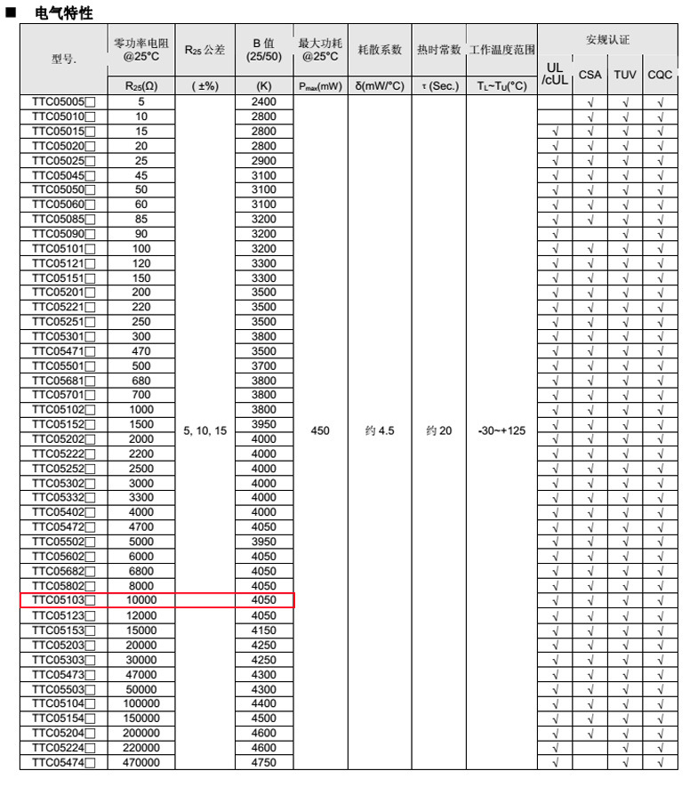 10K精度熱敏電阻TTC05103