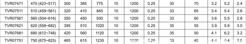 壓敏電阻片徑: Φ7mm 標(biāo)稱壓敏電壓(@1mADC): 510V(459~561)